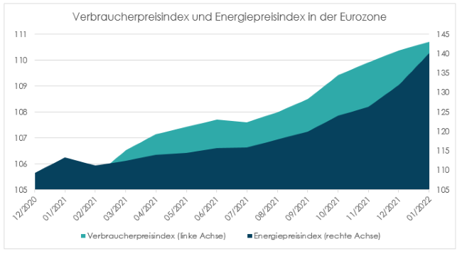 Man hatte auf einen vorübergehenden Anstieg der Inflation gehofft, doch dieser scheint sich noch länger hinzuziehen. Wie in Grafik 1 unten zu sehen ist, sind steigende Energiepreise die Hauptquelle der Inflation in Europa. In der Eurozone trug Energie zwischen April und Dezember 2021 mehr als 50% zum Preisanstieg bei. Kurzfristig wird der russisch-ukrainische Konflikt die Lage wahrscheinlich nicht verbessern. Derzeit basieren 20% der in Europa verbrauchten Energie auf erneuerbaren Energien. Das Ziel der Europäischen Union ist es, bis 2030 auf 40% zu steigen. Wie kann man die Auswirkungen der Energiewende auf die Energiepreise und damit indirekt auf die Inflation zu ermitteln?