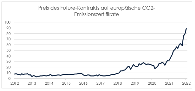 Grafik 2: Entwicklung des Terminpreises auf europäische Emissionszertifikate (MO1 Comdty)