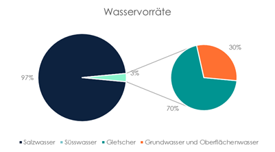 Aber nur 3 % sind Süsswasser, und davon sind noch 75 % als Eis an den Polen gebunden. Diese lebenswichtige Ressource ist also letzten Endes rar und zudem nicht für alle Menschen gleichermassen zugänglich. 60 % der natürlichen Quellen liegen in nur neun Ländern. Der Zugang zu sauberem Trinkwasser ist damit äusserst ungleich verteilt und wird ausserdem durch zahlreiche weitere Faktoren erschwert. Wasserverschwendung und Klimawandel führen dazu, dass die weltweit verfügbare Wassermenge immer kleiner wird. Hinzu kommen Umweltverschmutzung und weiter steigender Wasserverbrauch in den westlichen Gesellschaften. Das Weltwirtschaftsforum[1] hat bereits 2012 die „Wasserkrise“ unter die fünf grössten Gefahren für unsere Gesellschaft eingestuft.