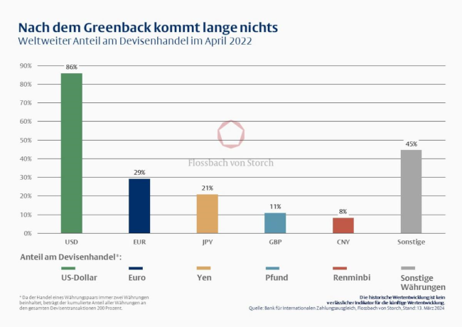 Aber nicht nur die Zahlungsströme innerhalb eines Währungsraums sind gigantisch. Auch der Devisenhandel hat unvorstellbare Dimensionen. Nach Daten der Bank für Internationalen Zahlungsausgleich (BIS) wurden im April 2022 täglich Devisen im Gegenwert von rund 2.100 Milliarden US-Dollar über den Kassamarkt gehandelt. Der US-Dollar, auch Greenback genannt, prägt den Devisenhandel dabei wie keine zweite Währung. In knapp 86 Prozent aller Devisentransaktionen am Kassamarkt war der US-Dollar Teil des gehandelten Währungspaars. Mit grossem Abstand folgt der Euro, der in immerhin 29 Prozent aller Fälle getauscht wurde (vgl. Grafik 1).