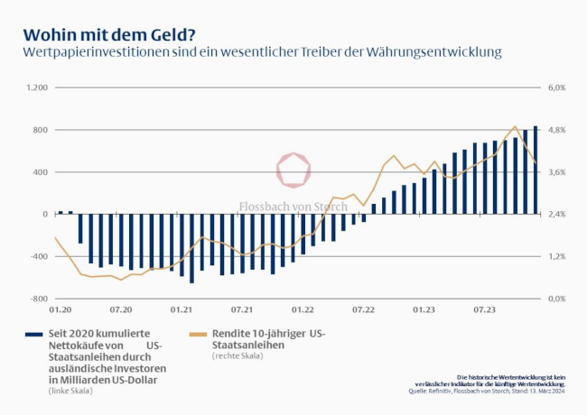 Im Herbst 2023 warfen 10-jährige US-Staatsanleihen zwischenzeitlich fünf Prozent per annum ab, und auch das Leitzinsniveau in den USA lag zu diesem Zeitpunkt bei etwas mehr als fünf Prozent. Das gestiegene Renditeniveau sollte dann auch zahlreiche Auslandsinvestoren anlocken. Zwischen Dezember 2021 und Oktober 2023 erwarben sie US-Staatspapiere im Gegenwert von netto rund 1.181 Milliarden US-Dollar (vgl. Grafik 2).