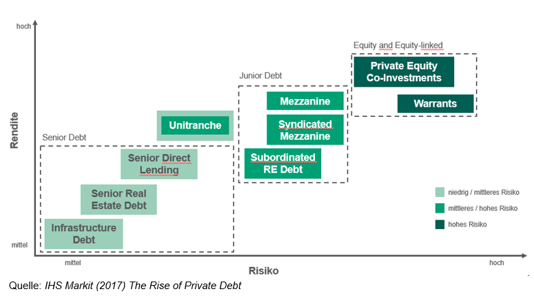 Auf der anderen Seite stehen die Investoren, die anstelle von Banken als Kreditgeber dieser Unternehmen fungieren. Spezialisierte Fondsmanager bzw. Fondsmanagerteams richten ein Anlagevehikel (geschlossenen Private Debt Fonds) mit fester Struktur und Strategie ein und ermöglichen damit den Investoren des Private Debt Fonds als Kreditgeber zu fungieren. Strukturell unterscheiden sich Private Debt Fonds grundsätzlich hinsichtlich der Besicherung und Befriedigungsrangfolge (siehe Grafik). Klassischerweise besteht ein Private Debt Fonds meist aus 20 bis 30 Darlehen an verschiedenen Unternehmen.