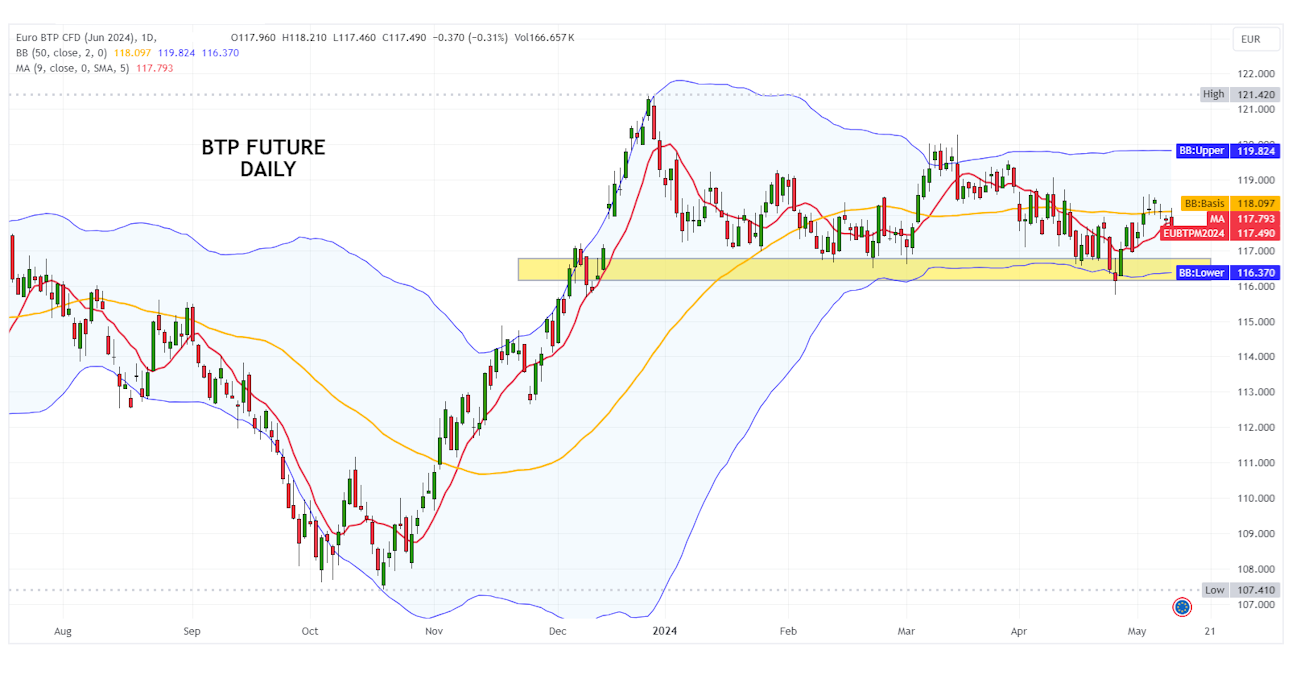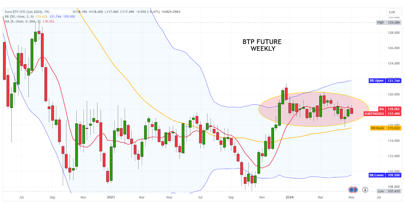 Nachdem der Btp-Future auf einen Tiefstand von 115,76 Punkten gefallen war, erholte er sich schnell, konnte aber die solide grafische Barriere bei 118,60-118,80 Punkten nicht durchbrechen. Die kurzfristige technische Situation bleibt also prekär: eine angemessene Erholungsphase wird in der Tat notwendig sein, bevor ein Anstieg mit einer gewissen Konsistenz beginnen kann.