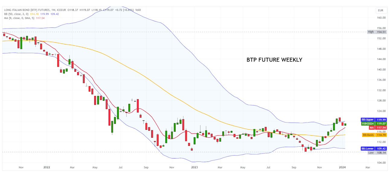 Nachdem der BTP-Future gegen Ende 2023 auf einen Höchststand von 121,43 Punkten gestiegen war, erfuhr er eine schnelle Korrektur und fiel auf 117 Punkte. Trotz dieses Rückgangs bleibt der kurzfristige Trend weiterhin positiv: Bevor eine neue Ausdehnung versucht werden kann, ist jedoch eine angemessene Wiederauffüllungsphase erforderlich. Aus grafischer Sicht könnte eigentlich nur der Ausbruch über 121,50 ein neues richtungsweisendes zinsbullisches Signal liefern. Eine weitere Korrektur würde stattdessen bei 115,70 Punkten eine erste Unterstützung finden: Ein Abstieg unter diese letzte Marke wäre gefährlich, da er den Abwärtstrend zunächst in Richtung 114 und später in den Bereich 113-112,80 ausweiten könnte. Der Btp-Bund-Spread bleibt über 150 Basispunkten, steht aber nicht unter besonderer Spannung.
