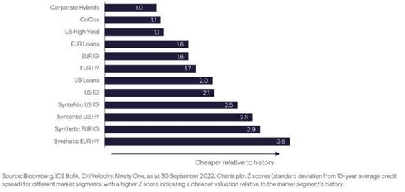 Durch die kategorische Neubewertung des Kreditrisikos waren zuletzt fast alle Credit-Anlageklassen in unterschiedlichem Maße attraktiv bewertet. Kontextanalysen zeigen jedoch, dass bonitätsstärkere und liquidere Marktsegmente vor dem Hintergrund der jüngsten Marktverwerfungen und des allgemeinen makroökonomischen Umfelds aus Anlegersicht am attraktivsten erscheinen. Abbildung 1 zeigt dies sehr deutlich.
