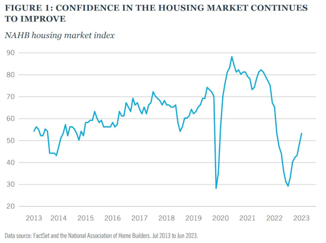 Ein Bereich der Wirtschaft, den die Anlegerinnen und Anleger nicht durch eine rosarote Brille betrachten, ist der Immobiliensektor, der seit jeher als zuverlässiger Indikator für den wirtschaftlichen Abschwung gilt. Die Märkte erwarten nach wie vor den Zusammenbruch des Sektors, doch bisher hat er sich trotz stetig steigender Zinsen relativ gut behauptet. Die Juni-Daten zu den US-Baugenehmigungen, den Baubeginnen und dem Vertrauensindex der National Association of Home Builders (NAHB) gaben einen Einblick in den Zustand des US-Wohnimmobilienmarktes. Obwohl einige dieser Daten hinter den Konsenserwartungen zurückblieben, waren die Abweichungen meist harmlos. Sowohl die Baugenehmigungen für Einfamilienhäuser als auch der NAHB-Index erreichten den höchsten Stand seit zwölf Monaten (Abbildung 1).