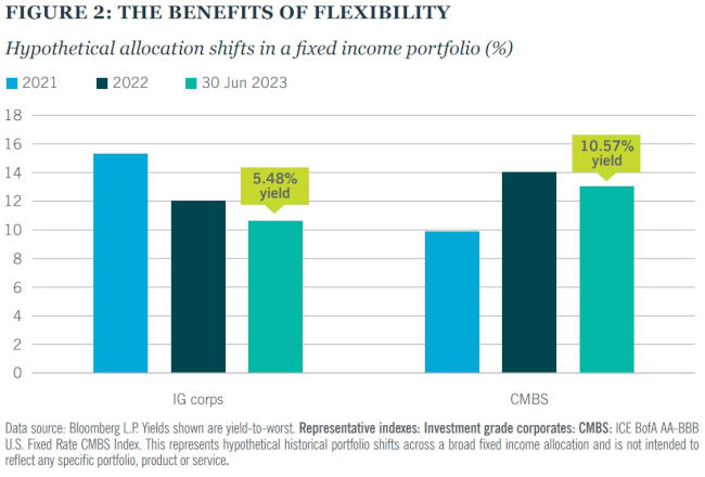 Im Gegensatz dazu sahen wir bessere Chancen im Bereich Emerging Markets Debt, da das Wachstum nach wie vor positiv ist und die Zentralbanken in jüngster Zeit die Leitzinsen in China und (wie wir erwarten) in Brasilien senken werden. Gewerbliche hypothekarisch besicherte Wertpapiere (Commercial Mortgage-Backed Securities, CMBS) ohne Bürogebäude sind im Vergleich zu Investment-Grade-Anleihen ebenfalls attraktiver geworden, da der Sektor in den letzten zehn Jahren von strengen Zeichnungsstandards und verbesserten Beleihungsquoten profitiert hat. CMBS bieten derzeit eine äusserst attraktive Rendite von 10,6 % und einen Aufschlag von 450 Basispunkten gegenüber Staatsanleihen – so viel wie nie zuvor ausserhalb einer Rezession. Abbildung 2 zeigt, wie ein hypothetisches flexibles Fixed-Income-Portfolio angesichts dieser Vorteile hätte angepasst werden können, indem aus Investment-Grade-Unternehmensanleihen in CMBS umgeschichtet worden wäre.