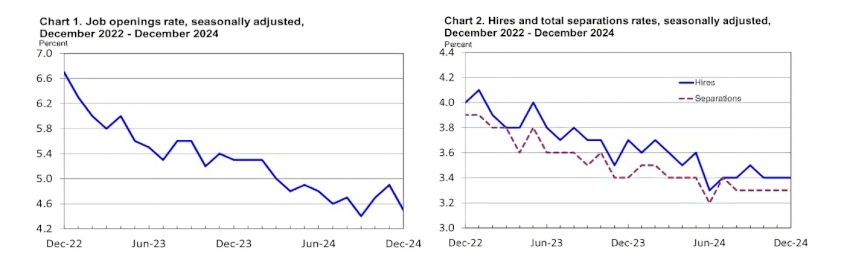 Der jüngste JOLTS-Bericht (Job Openings and Labor Turnover Survey) für Dezember 2024 meldet einen Rückgang der offenen Stellen. Trotz dieses Rückgangs bleibt die Nachfrage nach Arbeitskräften auf einem gesunden Niveau. Zum Wochenschluss zeigte der monatliche Bericht zu den Beschäftigtenzahlen ausserhalb der Landwirtschaft, dass im Januar solide 143’000 neue Arbeitsplätze geschaffen wurden – weniger als erwartet, aber bemerkenswert gut, angesichts hoher Zinsen, strengen Winterwetters und der Waldbrände in Los Angeles.
