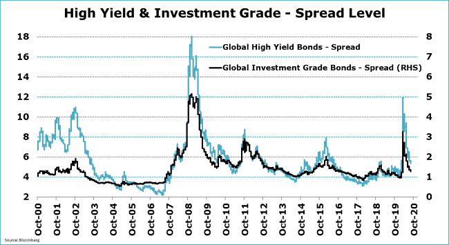 „Fünf Monate später stellt sich die Situation ganz anders dar. Die enge Zusammenarbeit zwischen der Notenbanken und den Regierungen ist zum Standard geworden. Dadurch sind die Anleihen-Spreads auf Niveaus gefallen, die nicht mehr weit von denen vor dem Ausbruch der globalen Covid-19-Pandemie entfernt sind.“