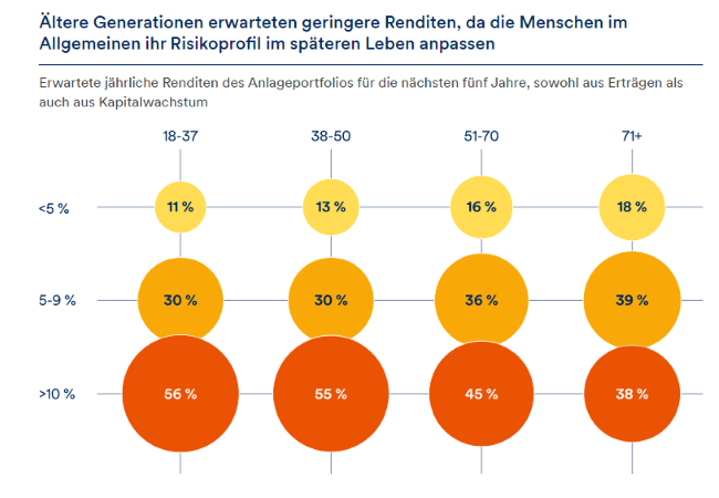 Jüngere Generationen erwarteten von ihren zumeist risikofreudigeren Anlagestrategien entsprechend höhere Renditen (siehe Grafik unten). Zum Beispiel ist die Zahl der 18- bis 37-jährigen, die eine Rendite von mehr als 10% pro Jahr erwarten, um 18 Prozentpunkte höher als die der über 71-jährigen. Dies ist jedoch nicht darauf zurückzuführen, dass die jüngeren Generationen optimistischer in die Zukunft blicken würde.
