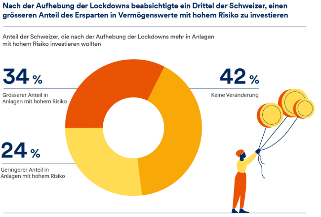 Über ein Drittel der Anleger wird verstärkt in risikoreiche Kapitalanlagen investieren, auch wenn die meisten mehr für Sparanlagen oder risikoarme Anlagen aufwenden. Trotz schwieriger Wirtschaftslage werden 37% der Anlegerinnen und Anleger als Folge der Aufhebung der Lockdowns mehr Geld in risikoreiche Anlagen investieren.