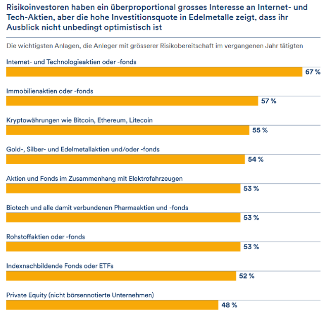 Weltweit setzen Anlegerinnen und Anleger, die eher bereit sind, in risikoreiche Anlagen zu investieren, vor allem auf Technologiefonds und –aktien, gefolgt von Immobilienfonds und Kryptowährungen.