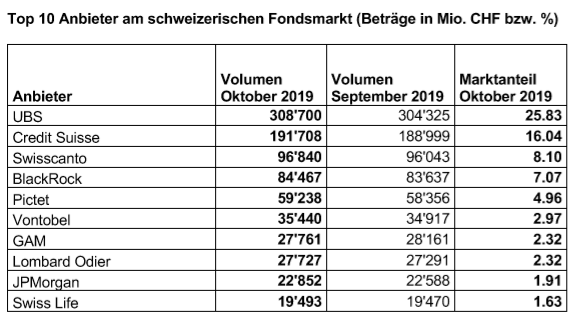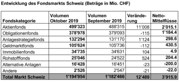 Die Nettomittelzuflüsse betrugen im Oktober 2019 3.9 Mrd. CHF.