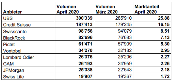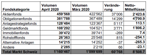 Die Nettomittelzuflüsse betrugen im April 2020 8.5 Mrd. CHF.