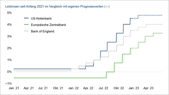 Vor dem ruhigeren Feiertagshandel haben die Notenbanken nach einem turbulenten Jahr 2022 Mitte Dezember noch einmal das Geschehen an den Finanzmärkten bestimmt. Besonders die begleitende Kommunikation zu den Zinsentscheidungen sorgte einmal mehr für grössere Kursausschläge. Die entscheidende Frage für Anleger ist, wie stark die Zinsen über das aktuelle Niveau hinaus noch steigen. Es wird deutlich, dass sich zwischen den jüngsten Notenbank-Verlautbarungen und den Einschätzungen am Markt ein klarer Unterschied verfestigt hat. Die Geldmärkte preisen auch nach den jüngsten Zinsentscheidungen auf Basis von Zinsderivaten in den USA ab Mitte des nächsten Jahres und im Euroraum ab Herbst fallende Zinsen ein. Dies steht ganz im Gegensatz zu eher „hawkishen“, also auf weitere geldpolitische Straffung bzw. auf eine länger restriktive Geldpolitik deutende Aussagen. 2023 wird also für die eine oder andere Seite eine grössere Anpassung mit sich bringen – was für anhaltend schwankungsreiche Märkte spricht.