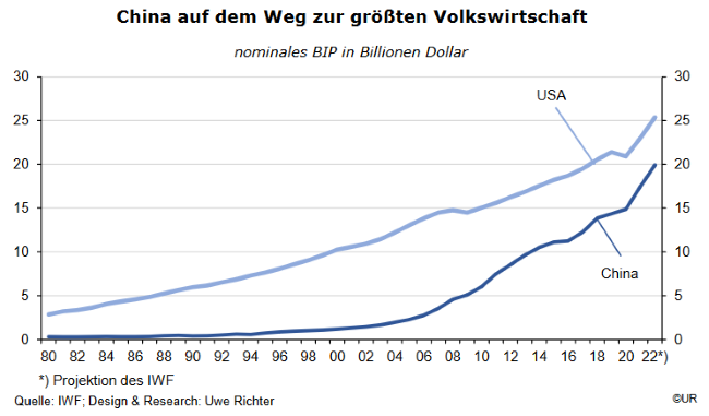 Früher einmal galt, wenn die USA husten, bekommt der Rest der Welt eine Grippe. Inzwischen trifft das eher auf China zu, den mit Abstand größten Akteur im internationalen Handel und bald auch die größte Volkswirtschaft. Bewertet mit sogenannten Kaufkraftparitäten, also einem künstlichen Wechselkurs, der zurzeit stark von dem Wert abweicht, der täglich an den Devisenmärkten ermittelt wird, ist China bereits die Nummer eins.