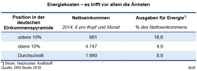 Die Tabelle zeigt, dass die Menschen im unteren Zehntel der deutschen Einkommenspyramide im Jahr 2014 18,6% ihres Nettoeinkommens (von durchschnittlich €681 pro Monat) für Strom, Heizung und Benzin ausgaben. Erhöhen sich deren Preise um, sagen wir, 50%, steigt ihr Anteil auf 27,9%. Hatten sie vorher für andere Güter und Dienstleistungen €554 pro Monat zur Verfügung, sind es nach dem Preisanstieg für Energie nur noch €491. Das entspricht einem Rückgang ihres verfügbaren Einkommens um 11,4%, eine Katastrophe und ein Rezept für eine tiefe Rezession.